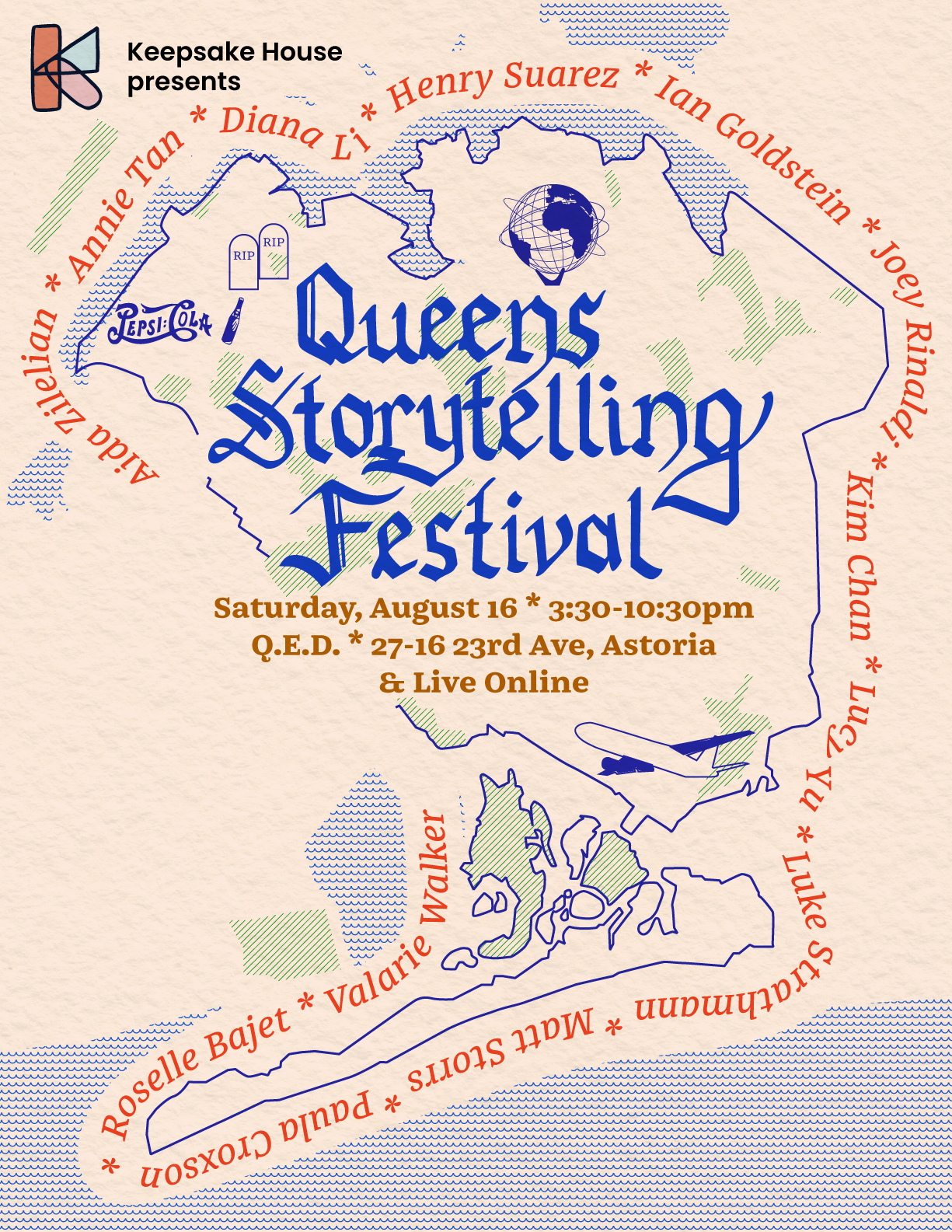 Join us for the inaugural Queens Storytelling Festival, an all-day to late-night festival featuring local NYC storytellers. Festival programs include live performances, panelists who will discuss their craft and writing, opportunities to connect with other local artists, ghost stories, and even a chance to share your “surprise stories.” The theme is "Queens:" the borough, the women, the icons, however you choose to define it. Hear stories from Keepsake House 2025 Artists in Residence Aida Zilelian, Joey Rinaldi, Roselle Bajet, and more!